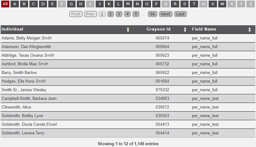 - Note that some records include Smith as the Maiden Name (i.e., Adams, Betty Morgan Smith), some as the First Name (i.e., Barry, Smith Barlow) and some as part of the Last Name (i.e., Clinesmith, Alice).