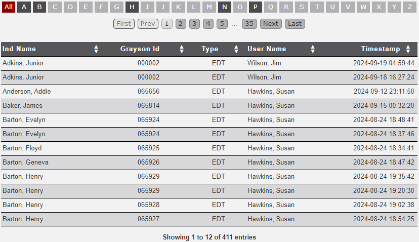 - Enter a single Grayson Id to display all of the transaction table for the indicated Id.